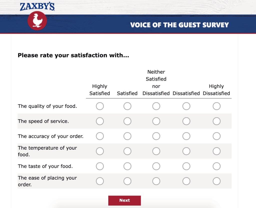 During the survey you will be asked a series of standard Guest Experience Survey questions, they will include questions about customer service, cleanliness of the store, taste and temperature of your food, if you were satisfied overall and if you would return/ recommend them to others.