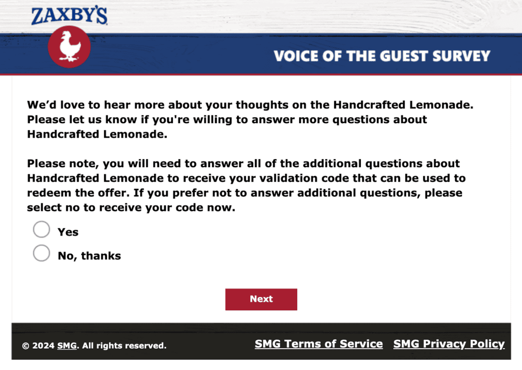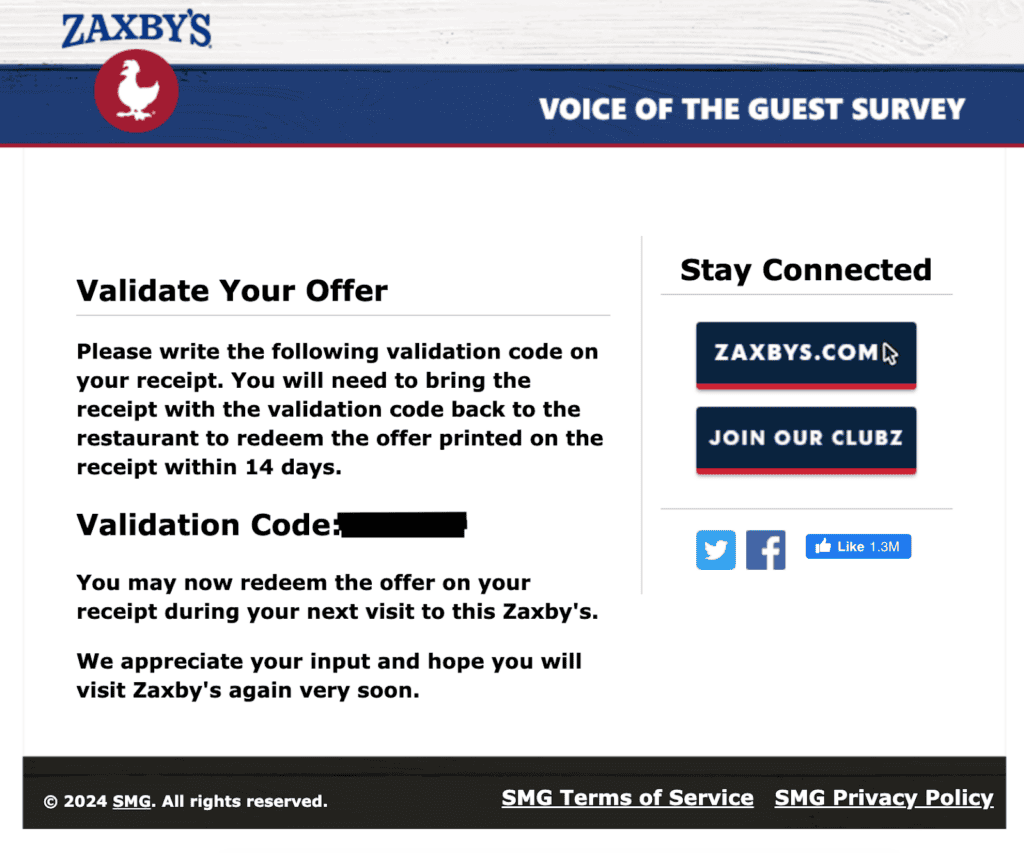 The final questions are just to learn your age and how often you visit Zaxbys. Once you tap Next you will be taken to the Validation Code page.